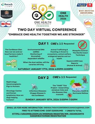 This annual One Health Conference is in its eighth year, having been inaugurated in 2018 as a collaboration between the Caribbean College of Family Physicians Jamaica Chapter and the Jamaica Veterinary Medical Association. Our first 2 events were "in-person" but since the Covid-19 pandemic has been virtual, and is now held in January during One Health Awareness Month.