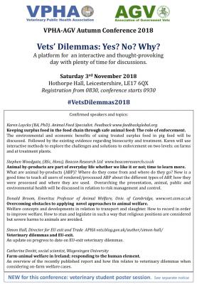 Events overview United Kingdom - Theddingworth, England - Friday 02 November 2018 → Sunday 04 November 2018Veterinary Public Health Association Conference: Vets’ Dilemmas. Including swill feeding, animal by-products and welfare Student competition A one-day conference in Leicestershire. Www.vpha.co.uk/events 2018 Europe United Kingdom National Event (Country-wide) Visit website Event detailsDate: Friday 02 November 2018 → Sunday 04 November 2018Location: United Kingdom - Theddingworth, EnglandAddress: Hothorpe HallType of event: National Event (Country-wide)Attendance fee: Yes. See websiteOpen for public: yesMore information: ---