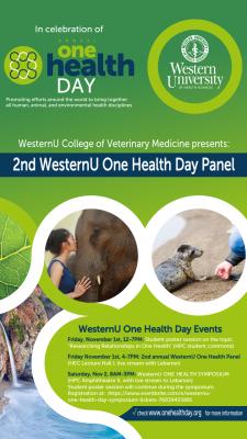 WesternU is joining the world-wide effort by promoting this concept through collaboration, communication, and outreach. One Health PANEL discussion is sponsored by the WesternU Office of the Vice-President for Research and Biotechnology. We will have live streaming with Lebanon Campus (Oregon), and a few of our colleagues will present from there as well. Topics will include: Climate change issues, biomedical/translational research, patient care, nutrition in medicine, reverence for life, pet therapy, emerging infections, and interprofessional education.