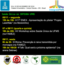 The Federal University of Mato Grosso do Sul (UFMS) will host, from Nov. 05 to 10, the "II Integra UFMS", an institutional event to connect the Community to all the teaching, research and extension produced by the University. During the Integra our team will present the results of "LeishNão Project" (health education on leishmaniasis), will offer a workshop about bat rabies prevention (using information from our research projects and in connection to the Bat Rabies Education Team/One Health Commission - "BRET/OHC"), and also will have a Talk Arena about "What's gonna be the next epidemic?".